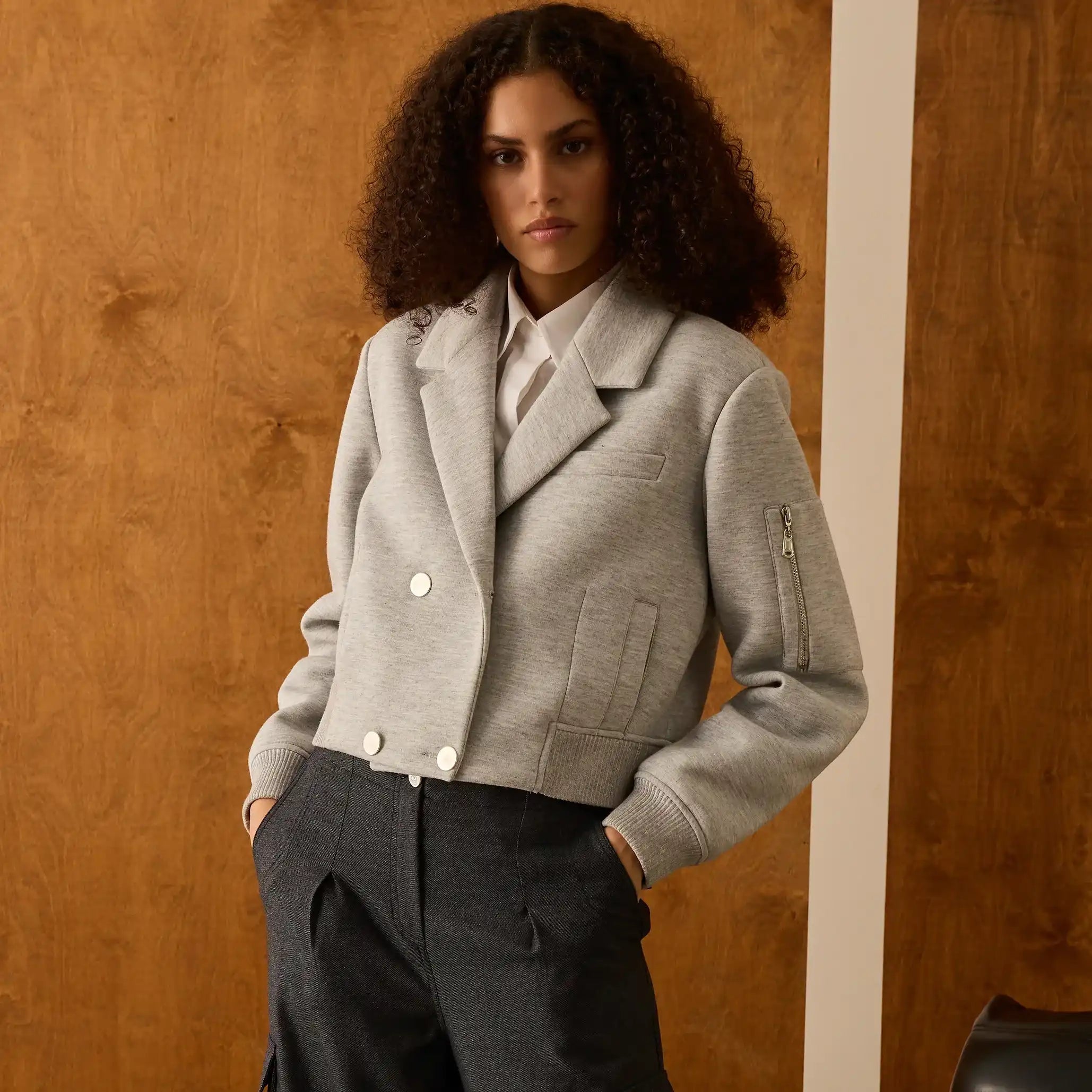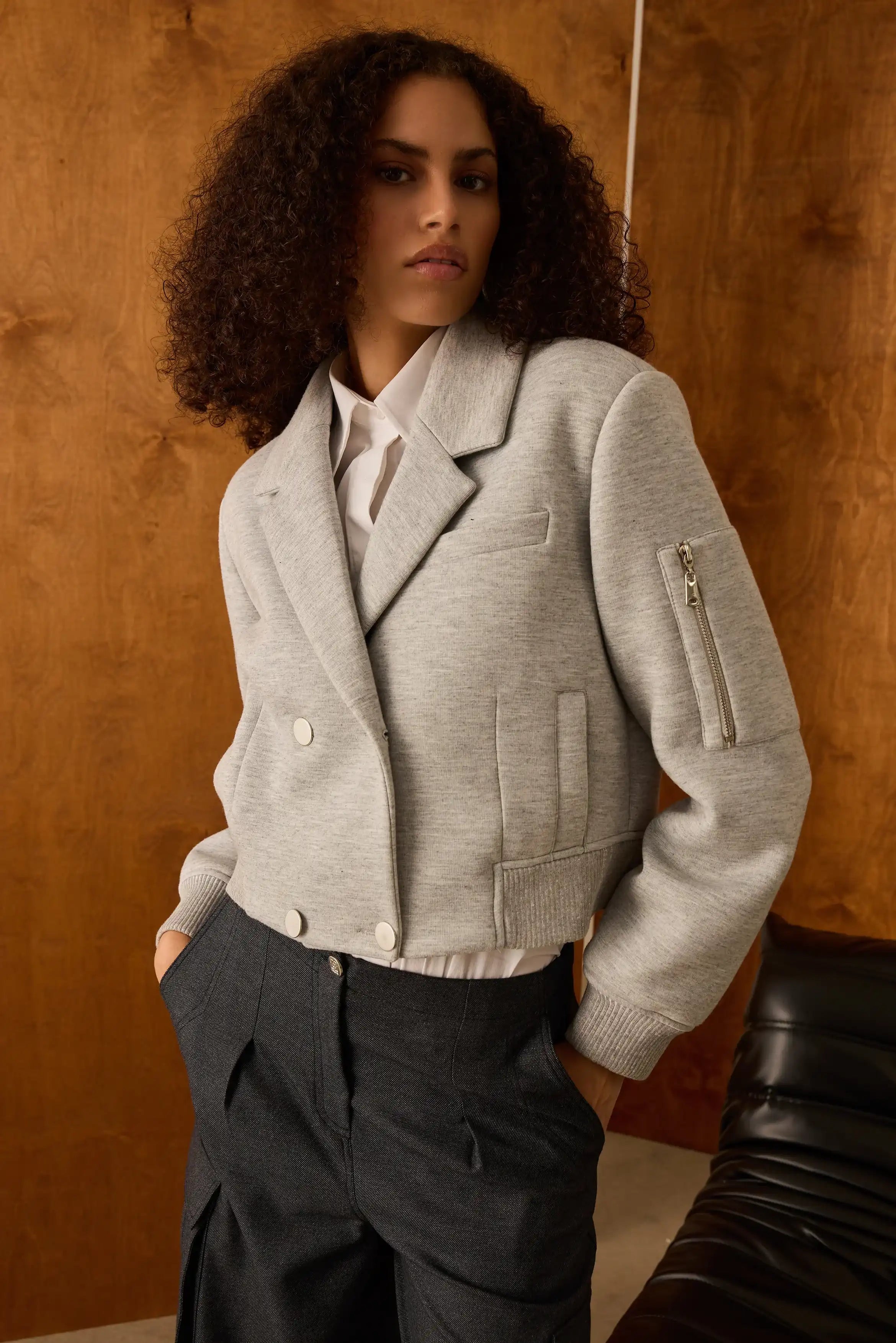 Grinin prestijli tonunu modern kruvaze yaka tasarımıyla buluşturan bu bomber ceket, şehir stiline rafine bir dokunuş kazandırır. Çift düğmeli ön kapaması ve fonksiyonel cep detaylarıyla hem maskülen hem dengeli bir siluet sunar.